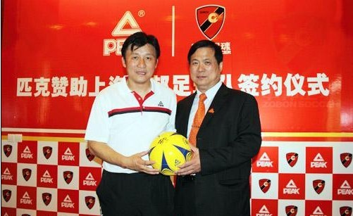 上海中邦足球主教練成耀東(左)與匹克集團(tuán)董事長許景南(右)