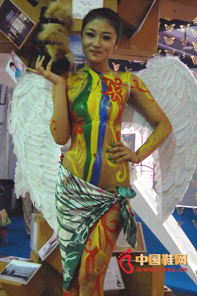 一只只輕盈靈動的小鳥在展館兩側組成兩片簾子,把展館布置得如夢似幻而又溫馨浪漫。中間是一顆幸福樹……印心鳥的展館在眾多展館中顯得十分美麗獨特,吸引了很多廠商的到來。而在那棵幸福樹下,人體彩繪秀則讓印心鳥吸引了更多客商的眼球。