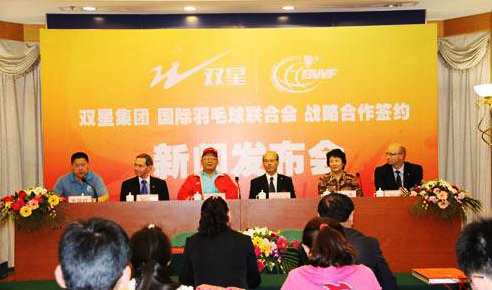 簽約儀式由雙星集團副總經理生錫順主持并做新聞發布,國際羽毛球聯合會派山副主席與雙星名人體育用品有限公司總經理于群力簽定了戰略合作協議。雙星與國際羽毛球聯合會達成為國際羽聯的技術官員、裁判員、工作人員提供雙星系列產品等多項內容。