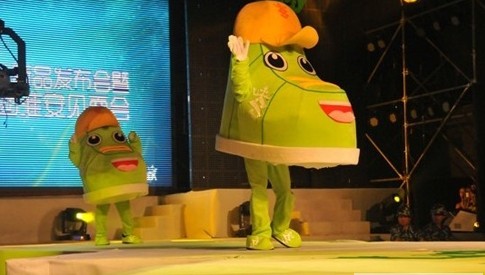 一對咧嘴開懷的吉祥物鞋寶貝在一場熱辣的開場舞后首次亮相,它們揮著手蹦蹦跳跳地上場與現(xiàn)場數(shù)千名熱情的觀眾見面,看它們那夸張的運動帽,前沿調(diào)皮地上翹;紅紅的嘴唇,時刻準(zhǔn)備親親寶貝;天真的雙眼,滴妞妞瞪得大大的;青春的綠色皮膚覆蓋著身子,居然下面還生出兩條能運動的腿,還真是名副其實的“板鞋”啊。