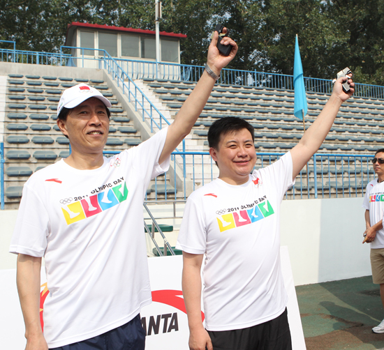 北京體育大學校長楊樺和安踏品牌總裁鄭捷共同鳴槍發令