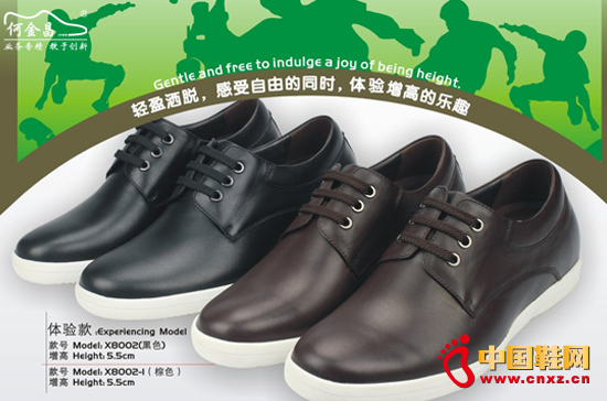 “” 內增高鞋的出現,點亮了所有想增高人的夢想,因為它采用的是物理增高原理,隱形的內增高設計,外觀不露增高痕跡,有立增高的效果,產品增高高度5.5CM-13CM不等,風格多樣可分為西裝、商務休閑、運動鞋、板鞋、男靴、涼鞋、特高七大系列,何金昌產品用料采用上等材質,精雕細琢,道道工序精益求精,傾心打造內增高鞋的經典之作。“何金昌”倡導的是一種由外而內的美,是漫漫人生路上自信從容的風度,是舉手投足之間優雅成熟的氣質。它代表的是男士對自信的追逐,對精神世界的探索,對豐神俊朗的向往,它不僅改變了外在的視覺形象,更塑造了堅實的內心世界。更可貴的是“何金昌”不只是身材矮小者的專利,只要你對自己身材不滿意,你都可以擁有——何金昌。