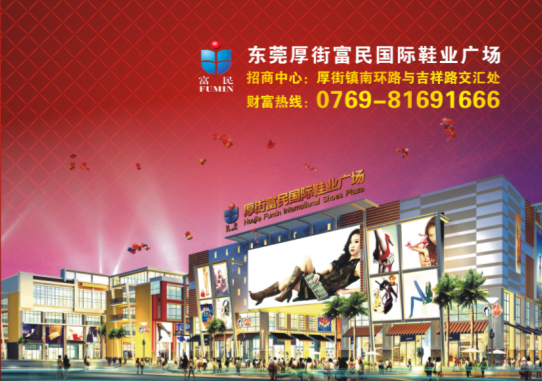 【中國鞋網-滾動快訊】東莞厚街富民國際鞋業廣場,16萬㎡國際鞋業交易門戶,是厚街規模最大的商業廣場,休閑娛樂配套齊全,具有專業化的商業經營管理服務及物業管理服務。富民國際鞋業廣場,繼一期成功運營之后,攜眾望,以恢弘之勢,將于2011年7月1日至3日隆重舉行全球招商活動,傾情打造二期8萬㎡世界品牌女鞋中心。 搶占商家、把握未來,富民國際鞋業廣場誠邀您的加盟。