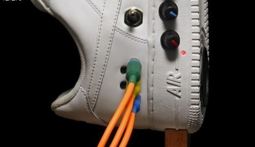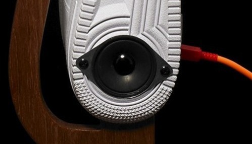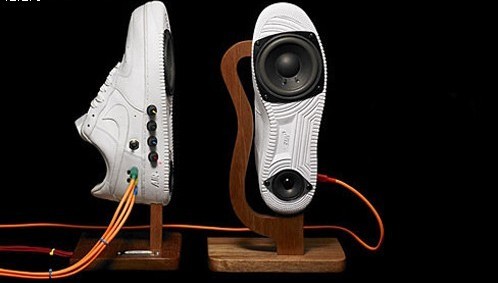 喜歡NIKE球鞋的朋友都知道這雙鞋,經(jīng)典板鞋空軍一號(hào),它被掛在了架子上,成了一對(duì)音箱。這是球鞋設(shè)計(jì)師Nash Money自己動(dòng)手制作的一對(duì)電腦音箱,將鞋底掏空,把音箱功放,單元等都一并安置在空軍一號(hào)中,然后掛在兩個(gè)支架上,這個(gè)想法實(shí)在是酷。