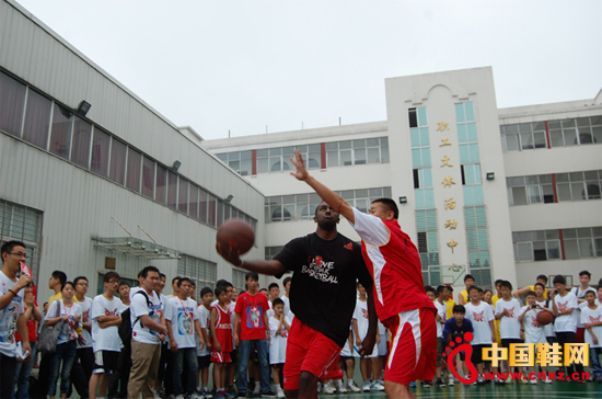 之后現場進行了1vs1和3vs3對抗賽。有意思的是1vs1對抗賽是由慶林運動的張總單挑帕特森。兩者的對壘與其說是對抗,不如說是游戲,兩人的攻守輪換極富有戲劇性,在張總大喊“我要用巴蒂爾的招牌動作防守你”之下,還是被帕特森突破進球,顯然這山寨老將難抵正牌新兵。