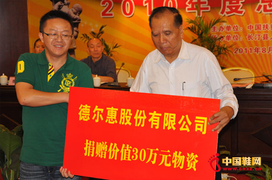 【中國鞋網-品牌動態】8月9日,中國扶貧基金會“母嬰平安120行動項目”2010年度總結交流會在福建省長汀縣舉行。會議上,股份有限公司再次向中國扶貧基金會捐贈價值30萬元的物資。中國扶貧基金會副會長陳開枝代表基金會接受了捐贈,并向的愛心善舉表達了謝意。至此,于2010年重慶水災期間承諾的100萬元物資捐贈已全部履行完畢。