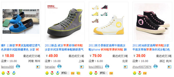 這款“蘋果-匡威”雙料山寨帆布鞋在淘寶上可以買到。搜索“蘋果帆布鞋”可以進(jìn)入頁面。據(jù)網(wǎng)店店主介紹,鞋是從韓國來的,只有女士的號碼。賣鞋商家來自浙江上海河南等地,不止一家,顏色多樣,款式齊全,提供7天之內(nèi)退貨的服務(wù)。鞋子售價僅32元(合5美元)。