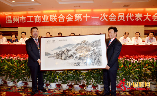 閉幕式上,工商聯新老主席進行了頗具意味的交接儀式:代表溫州市第十一屆工商聯執委會給市工商聯前主席、神力集團董事長鄭勝濤贈送了一幅山水畫作紀念,畫名“濤聲依舊”,利用兩個人名字的諧音,寓意工商聯“促進非公有制經濟健康發展、促進非公有制經濟人士健康成長”的服務職能“依舊”不變。