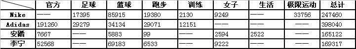 (注:總計(jì)包括NikeSportswear粉絲64035人,NikeStore粉絲15600人;adidas_NEO_LABEL官方微博粉絲41183人,adidasHK的粉絲45779人,adidas乒乓球中國(guó)代理粉絲15183人;安踏CCTV體壇風(fēng)云人物評(píng)選官方微博粉絲145750人,安踏兒童粉絲607人,沒(méi)有計(jì)入安踏董事局主席兼CEO丁世忠的個(gè)人粉絲137279人;李寧官方商城微博粉絲28453人,李寧bikeboy粉絲2543人,李寧籃球后衛(wèi)訓(xùn)練營(yíng)粉絲815人。)