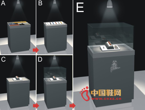 做好這些之后,你可以請來任何一個消費者,請他猜猜這五個展臺上鋼筆的價錢。不用說大家早就在心里有了答案。商品的價值就是通過各種方式的陳列表現給顧客。而我現在要說的并不是怎樣把一雙鞋表演得很高貴,而是陳列方式越恰當越好。如果你是做大眾運動品牌,把鞋裝到“玻璃罩”里就顯得不夠準確。