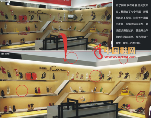 在東北,我們為一款女鞋品牌做終端設計,從藝術設計角度來看,我們的終端系統形式已經很完善,陳列柜的尺度、人體工程學格式、材料燈光等都是經過多次實踐檢驗的。但是,首個店鋪裝好試營業的時候,我們一到現場就發現視覺上特別不理想(如圖1)。拍了照片放在電腦里反復研究,整理出了七個問題,即鞋品陳列不規則、鞋托等小道具不考究、促銷紙貼太雜亂、環境擺設用色過多、營造開業氣氛的東西太簡陋、燈光照明不集中、裝修工藝太毛草。這些還只是一些表象,透析其中的內在根源,真正的問題有兩個:一個是決策者把終端店的更新程序看簡單了,設計階段沒有把終端目標說清楚,執行時又以為有了設計方案直接交給施工人員就好了,而施工人員沒有商展施工經歷,預留工期又太短,是成品與預期設想有距離的主要原因;二是忽略了商品陳列是一道相當重要的后期程序,太隨意的布局使環境變亂,像沒有打掃的新房,失去了效果。后來,該品牌店在我們的指導下進行相應的調整改進,整體效果有了很大提升。