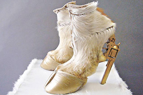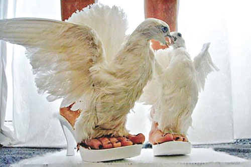【-設(shè)計(jì)師風(fēng)采】時(shí)尚界的鞋款設(shè)計(jì)已經(jīng)達(dá)到一個(gè)臨界點(diǎn),在比誰(shuí)較勁爆的生態(tài)中,德國(guó)女設(shè)計(jì)師 Iris Shieferstein 殺出重圍,以「尸鞋」獲得鎂光燈注目,連百變天后 Lady Gaga都愿意穿著幫襯。所謂的「尸鞋」是將馬蹄、老鼠、刺蝟和蛇的毛皮或蹄掌,改裝成高跟或平底鞋。而本文提供的圖片,正是順著鴿子尸體的形態(tài)所作出的大膽設(shè)計(jì)。這些鞋款至今沒(méi)太多明星敢穿上亮相,惟獨(dú)打份腥辣的 Lady Gaga 在去年歐洲巡迴演出時(shí),曾穿上內(nèi)文照片中的馬蹄鞋出場(chǎng),結(jié)果贏盡全場(chǎng)掌聲。然而無(wú)論尸體的來(lái)源是如何,將動(dòng)物踐踏在腳下還是一件令人爭(zhēng)議的事情,就看各位讀者自由心證了。