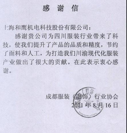 【-機械資訊】感謝貴公司為四川服裝行業(yè)帶來了科技,使我們提升了產(chǎn)品的品質(zhì)和精度,節(jié)約了面料和人工,為打造我們川渝現(xiàn)代化服裝產(chǎn)業(yè)做出了很大的貢獻,在此表示衷心感謝。