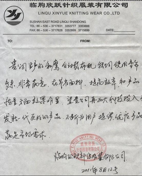 貴司生產(chǎn)的“和鷹”自動裁布機,我司使用生產(chǎn)多年,非常滿意,在節(jié)省面料,提高效率,和產(chǎn)品的質(zhì)量方面效果明顯,望貴司再加大投入,研發(fā)新一代的更好的產(chǎn)品,不斷為用戶提供優(yōu)質(zhì)產(chǎn)品,滿足市場需求。