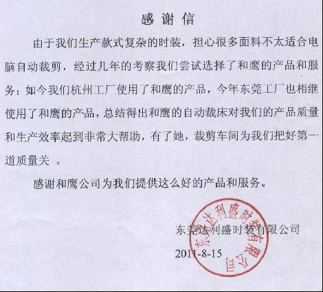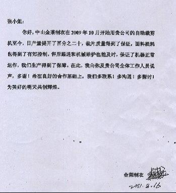 中山金萊制衣在2009年10月開始使用貴公司的自動裁剪機至今,日產(chǎn)量提升了百分之二十,裁片質(zhì)量得到了保證,面料損耗也得到了有效控制,售后根據(jù)和機械維護也能及時,保證了機器正常的運作,我們生產(chǎn)得到了保障,在此,我向貴公司全體工作人員說聲,多謝!希在良好的合作基礎(chǔ)上,我們多聯(lián)系!多溝通!多探討!為美好的明天共創(chuàng)輝煌。