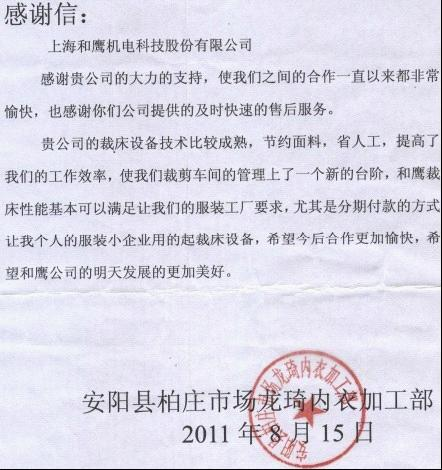 貴公司的裁床設(shè)備技術(shù)比較成熟,節(jié)約面料,省人工,提高了我們的工作效率,使我們裁剪車間的管理上了一個新的臺階,和鷹裁床的性能可以滿足我們服裝工廠的要求,讓我們服裝中心企業(yè)也能用的起裁床設(shè)備,希望今后合作愉快,希望和鷹公司的明天發(fā)展的更加美好。