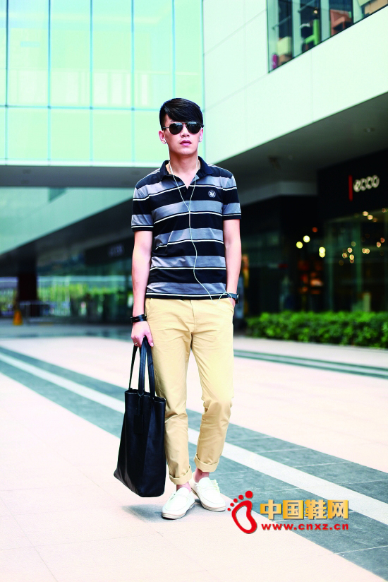 黑灰條紋的微領T下身搭配卡其色布褲和米色休閑鞋,氣場十足,宅男立馬變身“型男”。