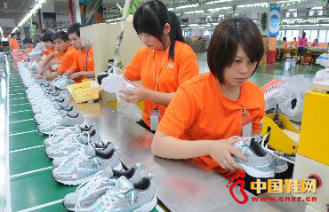 工人在晉江市某著名體育品牌運動鞋生產流水線上進行噴膠作業