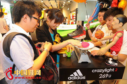 在位于淮海中路691號的魔方門口,adizero Crazy Light 2在氣球的帶動下懸浮在半空中,向路人展示著球鞋的輕盈。adizero Crazy Light 2在5月22日正式上市后,受到了大量籃球愛好者的關注,為了讓消費者更加直觀地感受到這雙全球最輕的籃球鞋的極限之輕,阿迪達斯特意在魔方內擺放了一臺天秤,消費者只需將任意隨身物品擺放在天秤一側并使另一側的adizero Crazy Light 2達到平衡,便可以獲得阿迪達斯Crazy Light 2氣球一只(總計送出100只氣球),以及adizero Crazy Light 2籃球鞋8折購物券一張,所有參與游戲的消費者均可獲得adizero Crazy Light 2籃球鞋9折購物券一張。