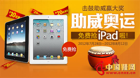 據了解,此次拍鞋網推出的“擊鼓助威奧運”活動是“零門檻”,在7月28號至8月12號奧運會期間,網友通過注冊拍鞋網會員賬號或者QQ號、百度、支付寶、新浪微博等賬號,均可登入拍鞋網官網變身擊鼓手,為遠在倫敦的中國奧運健兒擊鼓助威。此外,拍鞋網還設置了ipad、名鞋等百萬大獎,每一位為中國代表隊加油的擊鼓手,都能獲得相應的禮品。