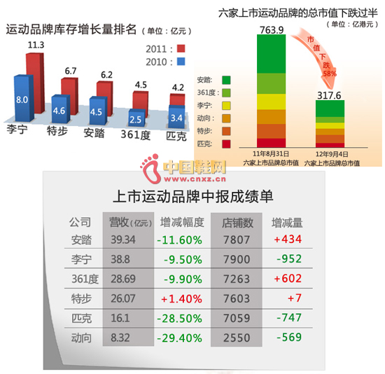 【中國(guó)鞋網(wǎng)-行業(yè)新聞】“奧運(yùn)年”歷來(lái)都是們賺得盆滿(mǎn)缽滿(mǎn)的“豐收年”,但2012年的日子卻不那么好過(guò)。李寧、安踏、特步等一批上市體育用品企業(yè),2012年最新訂貨會(huì)數(shù)據(jù)、庫(kù)存積壓數(shù)、計(jì)劃新開(kāi)店鋪等均處于近年來(lái)的最差水平,一些品牌甚至不惜用裁員來(lái)降低成本。國(guó)產(chǎn)運(yùn)動(dòng)品牌增長(zhǎng)陷入困局再次成為輿論關(guān)注的焦點(diǎn)。