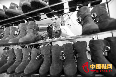 【中國鞋網-國內動態】近日,橫峰街道小作坊主王偉洪在車間內干活以節省雇人的開支。王偉洪說:“下半年還沒接到過訂單,只能賭款式先生產一些新款冬靴。”