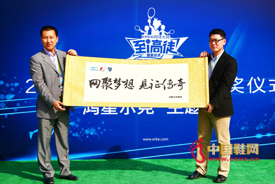 鴻星爾克集團品牌劉曉凡(左)向組委會官員楊亦斌(右)贈送紀念品