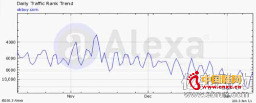 對(duì)于以流量為生的電商網(wǎng)站來(lái)說(shuō),網(wǎng)絡(luò)廣告的停止造成的影響尤其明顯。來(lái)自Alexa的數(shù)據(jù)顯示,好樂(lè)買官方網(wǎng)站的流量從2012年11月份開始微跌,12月份則急劇下跌,至今沒(méi)有回升的跡象。目前,好樂(lè)買的日均IP訪問(wèn)量下滑至8萬(wàn)左右,日均PV瀏覽量約66萬(wàn)。