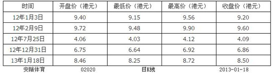在2012年12月31日,安踏體育的開(kāi)盤(pán)價(jià)為6.75港元,到2013年1月18日的收盤(pán)價(jià)為8.50港元,上漲幅度約25.93%.(中國(guó)鞋網(wǎng)-最權(quán)威最專(zhuān)業(yè)的鞋業(yè)資訊中心)