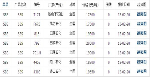 02月20日國內SBS橡膠各地市場價格