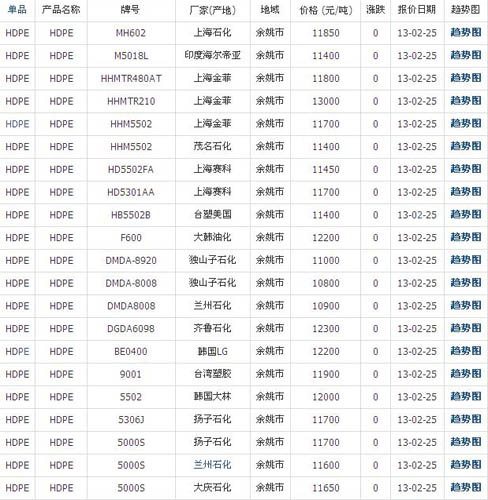 02月25日國內(nèi)各地塑料市場(chǎng)HDPE最新報(bào)價(jià)