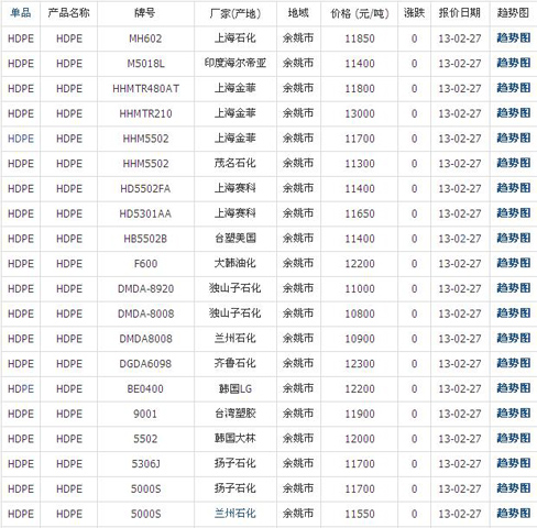 02月27日國(guó)內(nèi)各地塑料市場(chǎng)HDPE最新報(bào)價(jià)