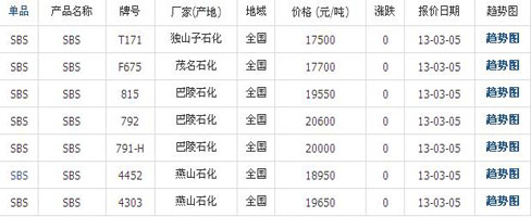 03月05日國內(nèi)SBS橡膠各地市場價格