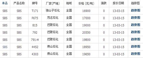 03月15日國內SBS橡膠各地市場價格