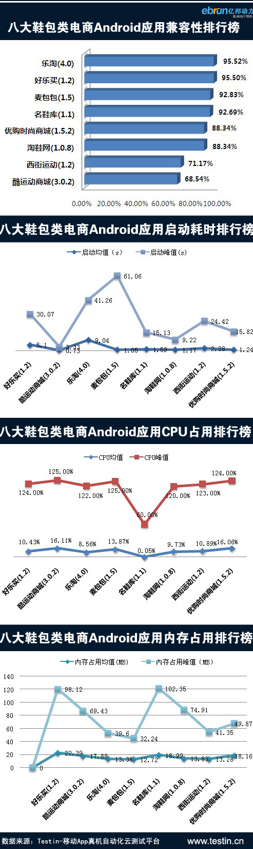 【中國鞋網-鞋業趨勢】測試結果顯示,八家電商App的平均啟動耗時長達2.8s,高出業內平均值很多。其中,樂淘網App平均啟動耗時最長,達9.04s,好樂買App平均啟動耗時也長達5.1s。