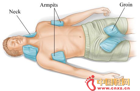 然后把病人衣服脫光,上身、額頭蓋上薄面料,把面料打濕,使勁扇扇子,借用水分蒸發(fā)的力量幫助病人快速降溫。能買到冰棍、冰鎮(zhèn)飲料的,把它放在塑料袋里后放到脖子、腋下、鼠溪處(見(jiàn)下圖)。