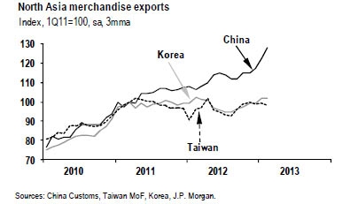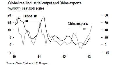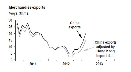 【中國鞋網-要聞分析】2013年伊始,各項新發布的宏觀經濟數據表明,中國經濟已步入溫和復蘇軌道。與此同時,強勁的出口勢頭是近期數據中令人驚喜的亮點之一,其中以最近三個月尤為突出,截至2月份經季節性調整后的出口商品總額季度環比跳漲52.5%。