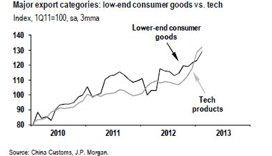 同時,在低附加值產品方面,紡織、服裝、玩具和鞋履等勞動密集度更高的消費類產品行業的前景則相對較難預測。盡管市場對中國生產成本增加普遍感到擔憂,而且出口商對自身競爭力的喪失怨聲載道,但本應受到成本上升不利影響的低端消費品出口卻在過去三年中實現了穩健增長(其速度幾乎接近技術類產品出口)(如附件第三張圖表所示)。