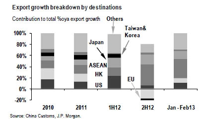 在區域需求增長方面,對港出口(2月份經季節性調整后的季度環比漲幅高達126.4%)占到了中國出口總量的15.8%,超過了東盟成為2012年下半年和今年頭兩個月拉動出口總量增長(按年度同比計算)的最主要因素(如附件第四張圖表所示)。與此同時,同期對美和對歐出口則遠低于以往水平。