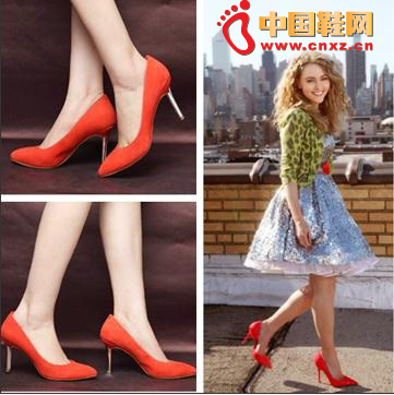 時尚尖頭的橘紅色酒杯跟鞋締造出女主角高貴優雅的氣質,亮眼的細跟更加襯托纖細腿部。
