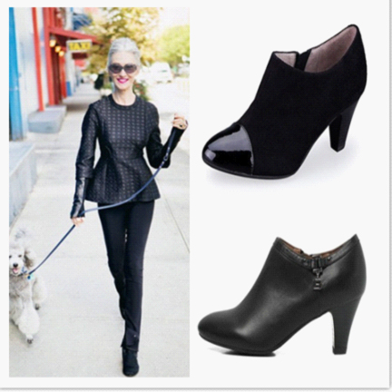 相對保守卻不失穩重,永不頹敗的經典黑色皮靴是絕對優選,不管是日常遛狗,或是出席正式場合,小低跟都是潮流的年長女士最容易選擇和搭配的款式;優購推薦款:BELLE/百麗(專賣店)2013春季黑小牛皮女皮鞋: ,le saunda/萊爾斯丹 休閑黑色羊絨皮女腳踝鞋: