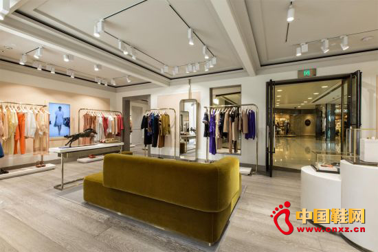 沿著錯落有致的階梯來到二樓,仿佛置身于每個女孩夢寐以求的衣帽間,通透落地窗引入自然光線,在光與影的交融中,典雅淺色基調結合金屬裝飾的簡潔線條讓空間更為充盈愉悅;當季新款成衣和配飾整齊得擺放在寬敞的走道兩側,在親昵而高雅的環境中,消費者可以體驗獨一無二的vip服務。