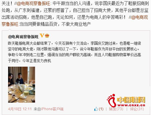 據(jù)資深電商觀察員魯振旺爆料稱。李國慶最近為鞋服招商到處跑。鞋服電商大會(huì)都結(jié)束了,石獅有個(gè)交流會(huì),李國慶又跑過去,也是唯一繼續(xù)堅(jiān)守的電商大佬。自己擔(dān)當(dāng)了招商大使,其他平臺都是總監(jiān)出席活動(dòng)招商。
