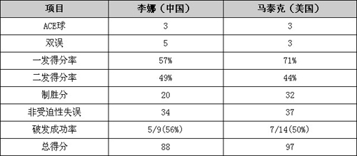 全場比賽李娜轟出3個ACE球但是出現了5次雙誤,而對手3個ACE球3個雙誤。一發得分率李娜要低于對手,尤其是后兩盤比賽表現得非常明顯;制勝分方面李娜比對手少了12個,馬泰克的搏殺非常見效,雖然非受迫性失誤李娜比對手也少了3個,但是這一環節沒有影響到大局。 李娜今日一共完成了5次破發,而對手則高效的7次破發得手。