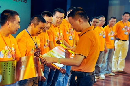 據活動負責人介紹,本次訂貨會全部流程都在公司總部進行,包括2000多人的大會。此外,貴人鳥還別開生面地舉行“因為有你”十大感動人物獎頒典禮,以及市場出征令儀式,將會議氣氛推向高潮。